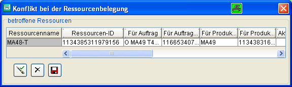 Planen sie einen Auftrag ein, in dem eine Ressource angegeben ist, die zeitgleich auf einer anderen Maschine in Gebrauch ist, so wird eine Liste angezeigt, die Sie über den Konflikt informiert. Ein Resourcenkonflikt wird auch angezeigt, wenn ein Werkzeug den Status 'nicht verfügbar' hat.