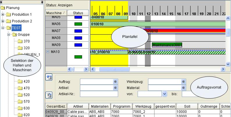 Das obere rechte Fenster ist die eigentliche Plantafel. Im linken Teil des Fensters finden Sie die Maschinen mit ihren aktuellen Betriebsarten. Auf der rechten Seite sind die Zeitbalken der Aufträge maschinen- und zeitbezogen angeordnet.